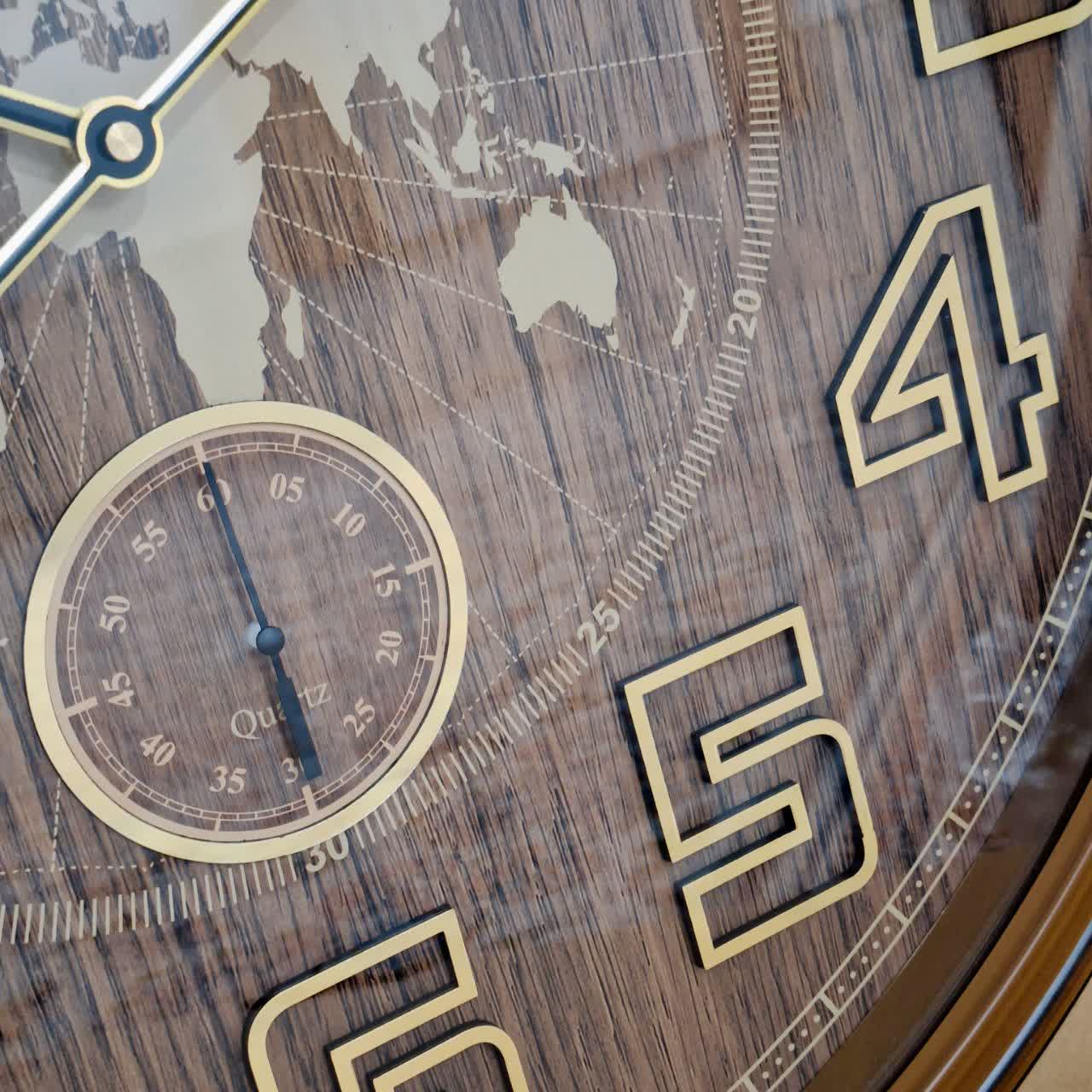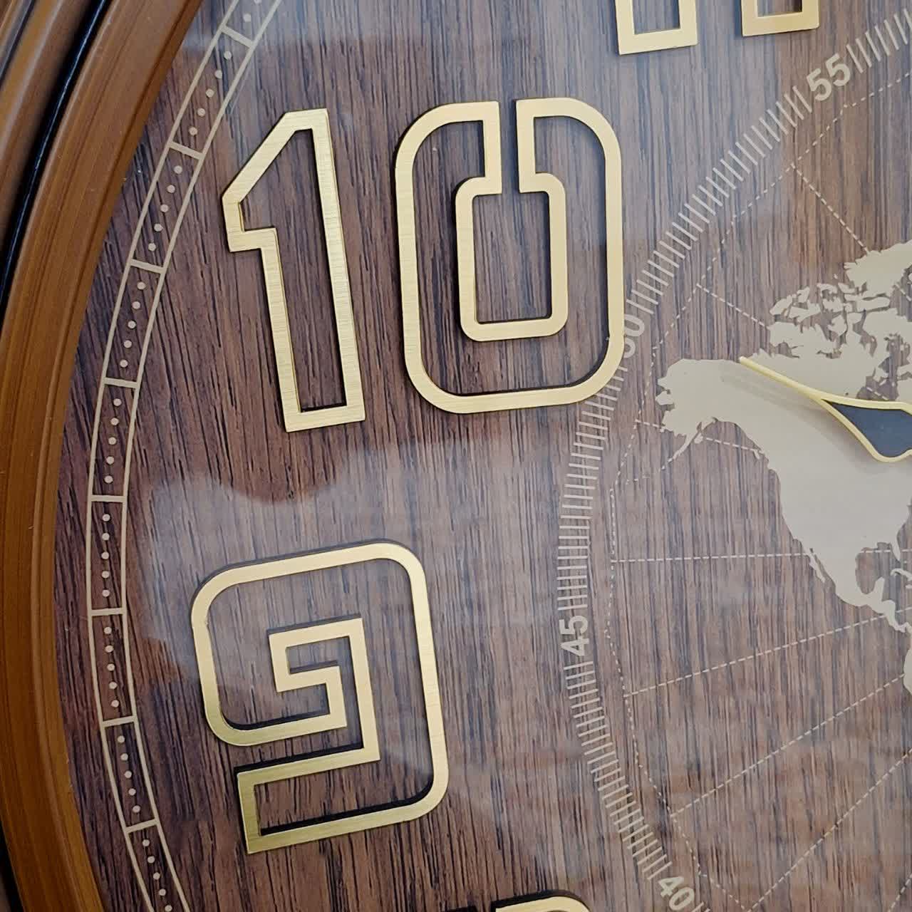 ساعت دیواری قهوهای 70 سانتیمتری با اعداد انگلیسی برجسته و طرح نقشه جهان